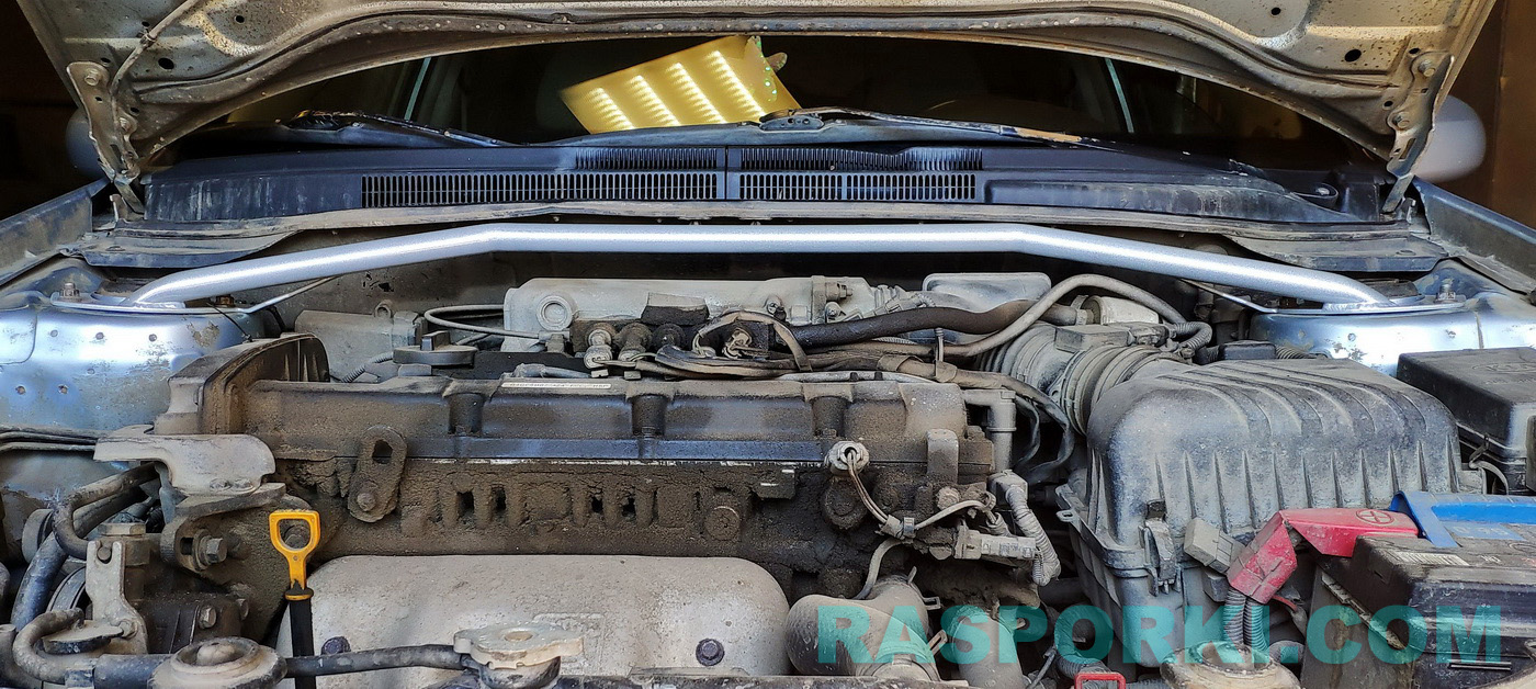 Распорка предназначена для Cerato 1 (2003-2008) с любым двигателем. Середина распорки расположена близко к жабо и не мешает работам под капотом. Кольца распорки формованы под профиль стаканов