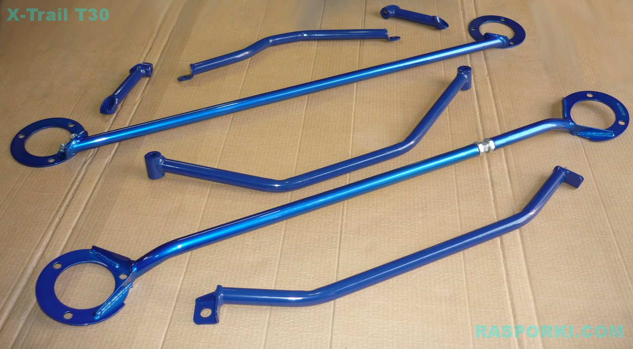 Причиной появления данной распорки стали трещины на переднем подрамнике X-Trail T30 в области крепления рычагов. Распорка противостоит смещению рычагов в сторону при движении автомобиля и предохраняет от подобных трещин. Совместима с всеми модификациями Т30/NT30. Снижает дорожный просвет между передними колесами.