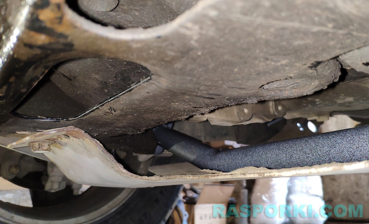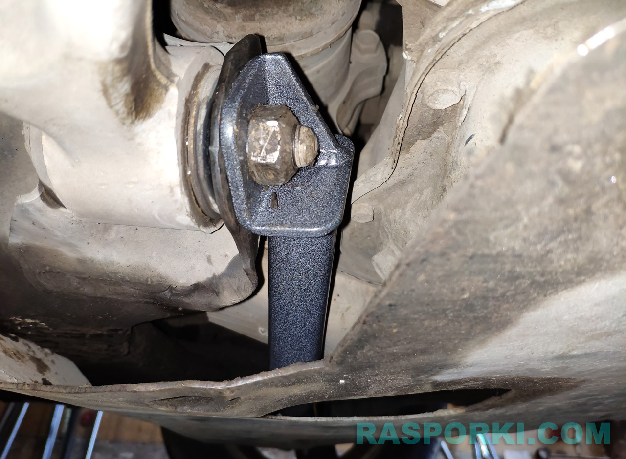 При установке с защитой двигателя потребуется подогнуть задние крепления защиты. Как правило, защита тонколистовая и легко подгибается. Распорка спрячется над защитой. См. фото ниже